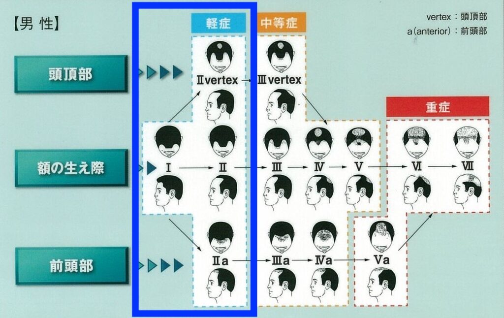 「誰にも薄毛を気付かれず改善できる状態」であり、この段階で治療を開始すれば、治療費用も少なく、治療期間も短くて済みます。