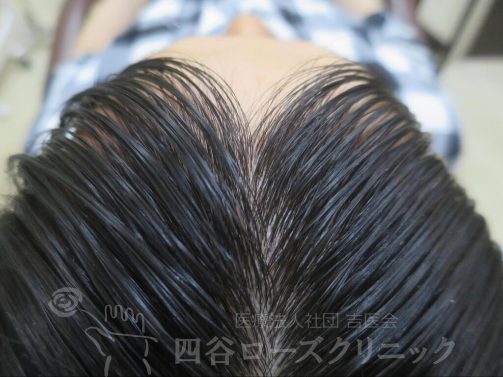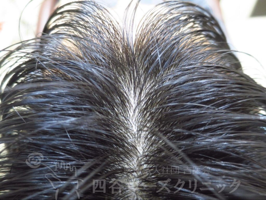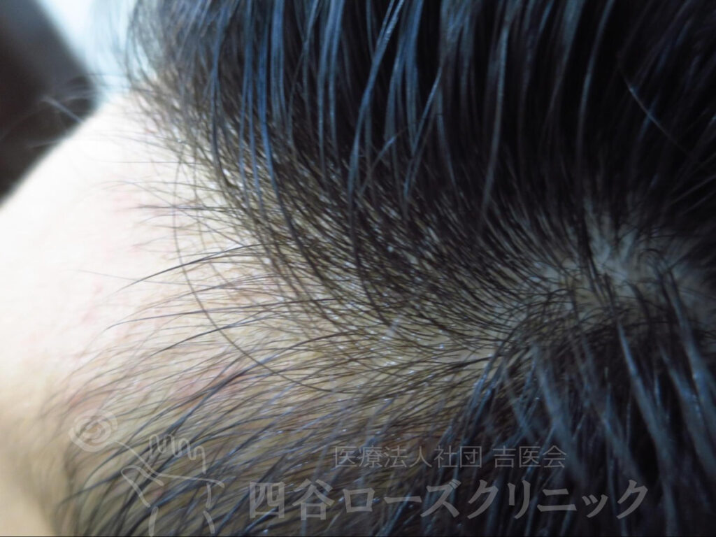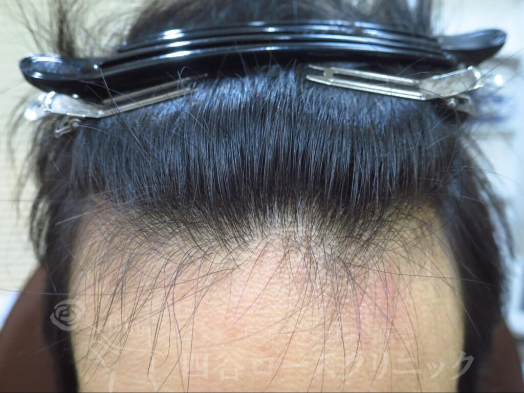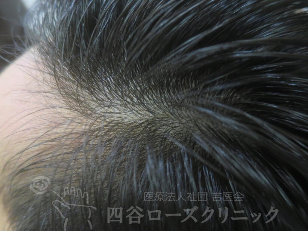 父がAGA。17~20歳の時に抜け毛が多く、濡れた状態で前頭部の薄毛を自覚。未治療。他覚的には全く薄毛とわからない状態であったが、本人が満足するまで前頭部ハーフで6回施術した。以後、年1、2回のメンテナンスを続けているだけで維持出来ている。