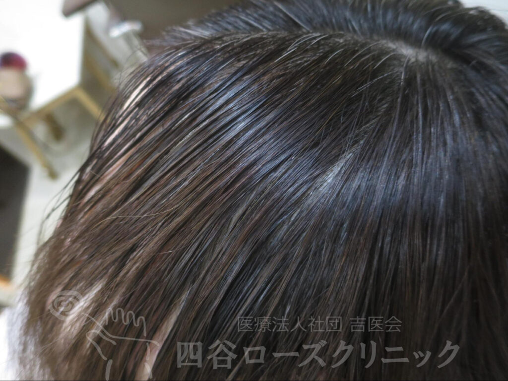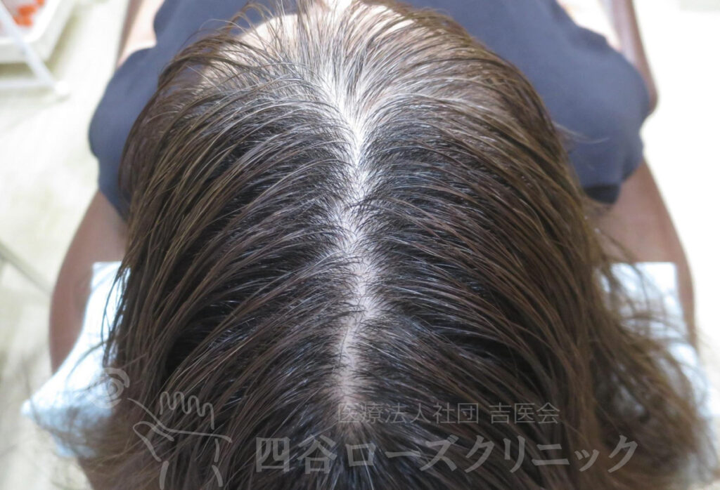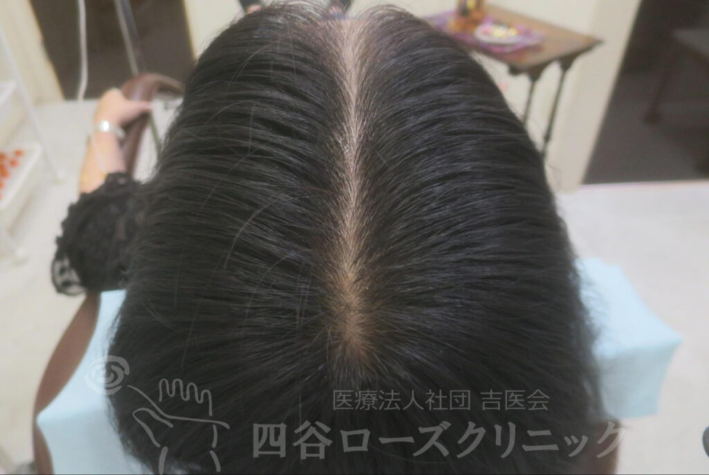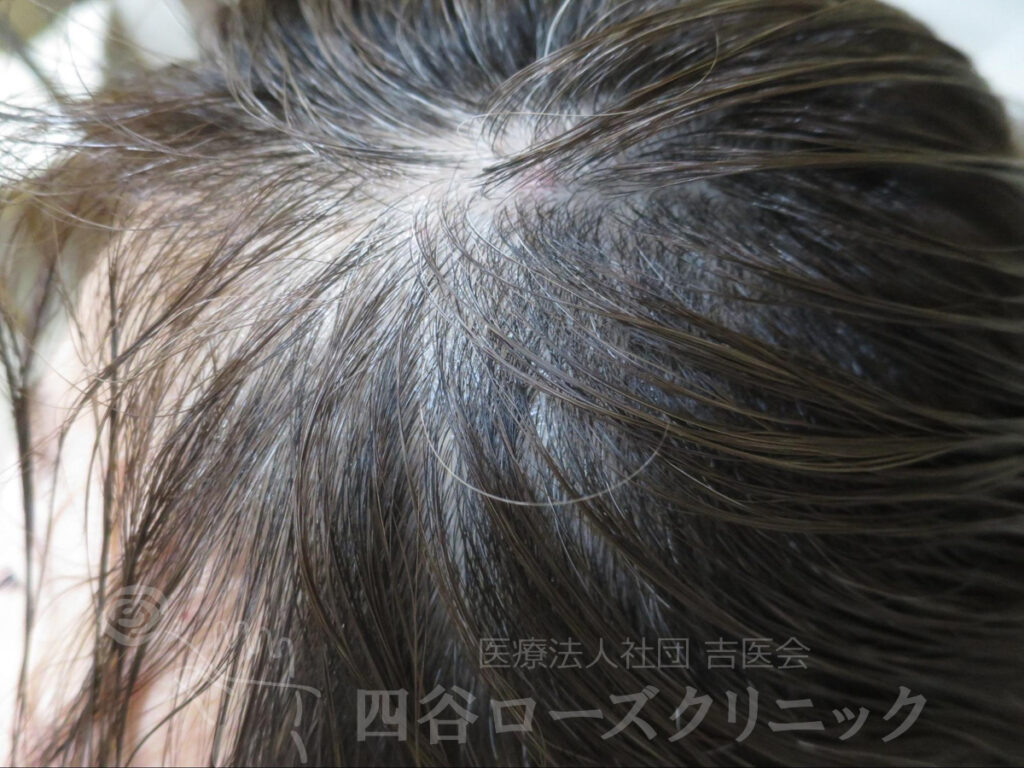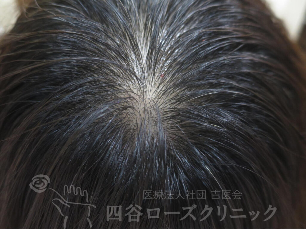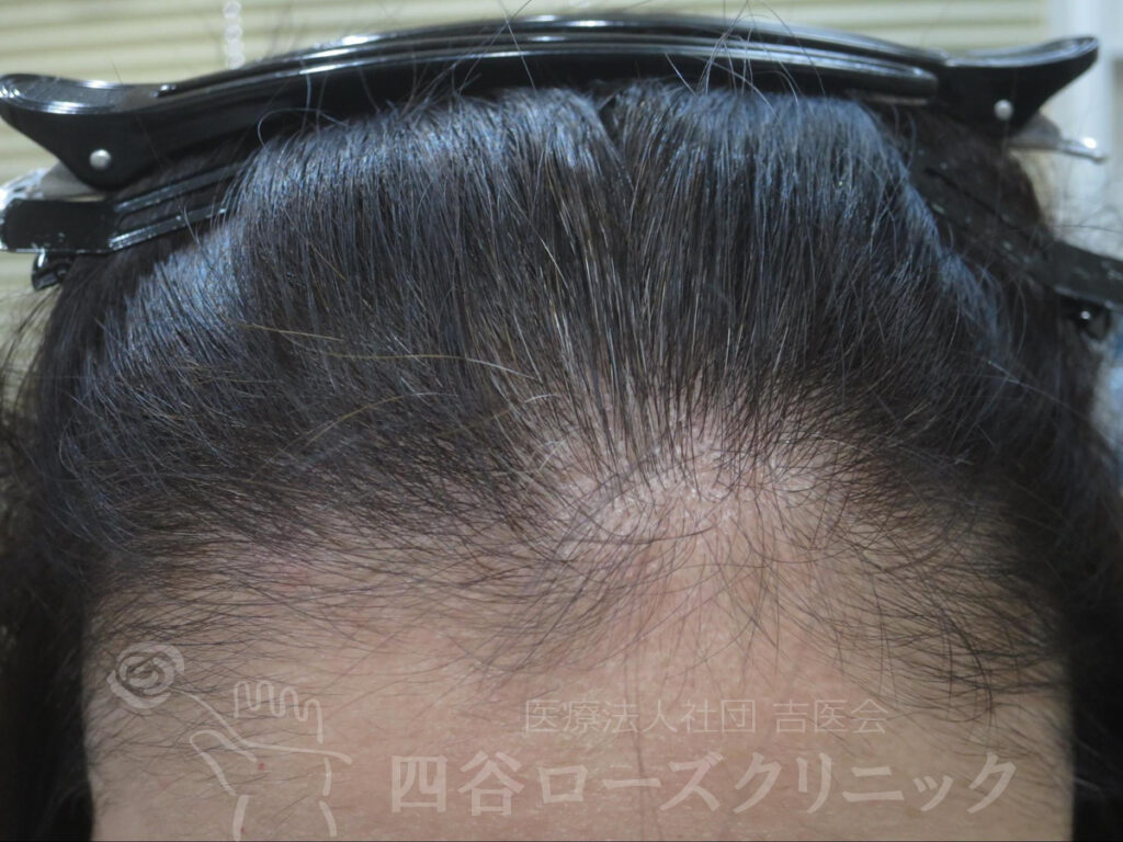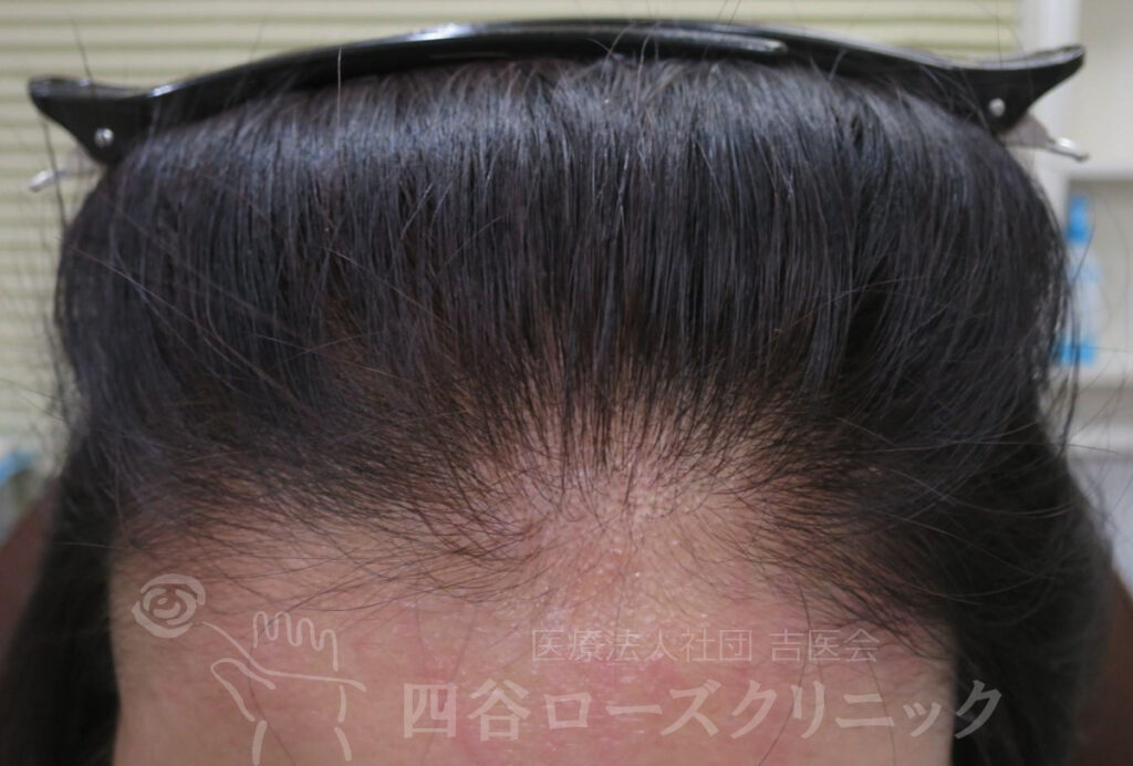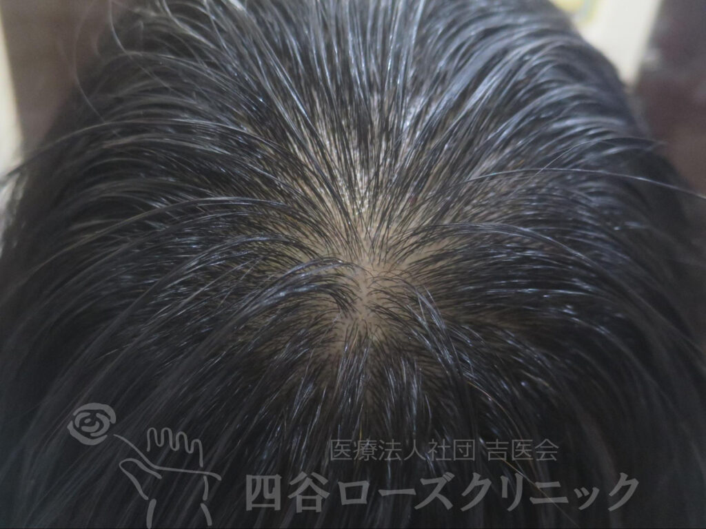 薄毛の家族歴なし。18歳頃から細く柔らかい毛髪となりボリュームダウン。育毛サロン、一般皮膚科、美容皮膚科、ミノキシジルの個人輸入、すべて効果がなく「うつ状態」になっていた。