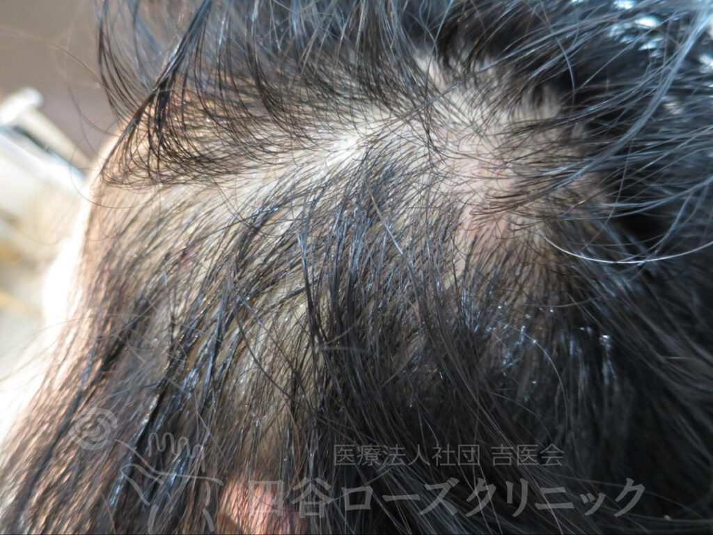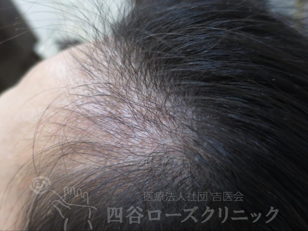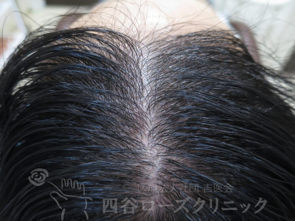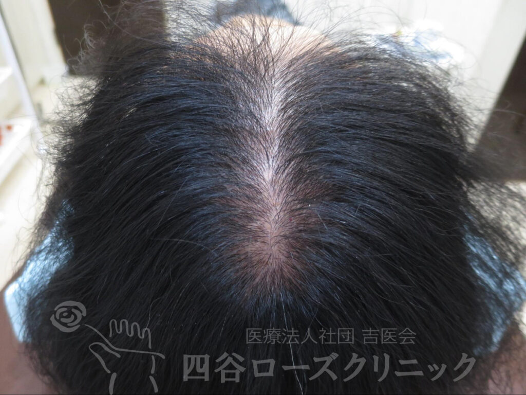 女系の薄毛の遺伝なし。前頭部、分け目の中等症。近医の皮膚科でミノキシジルの外用を処方されていた程度。