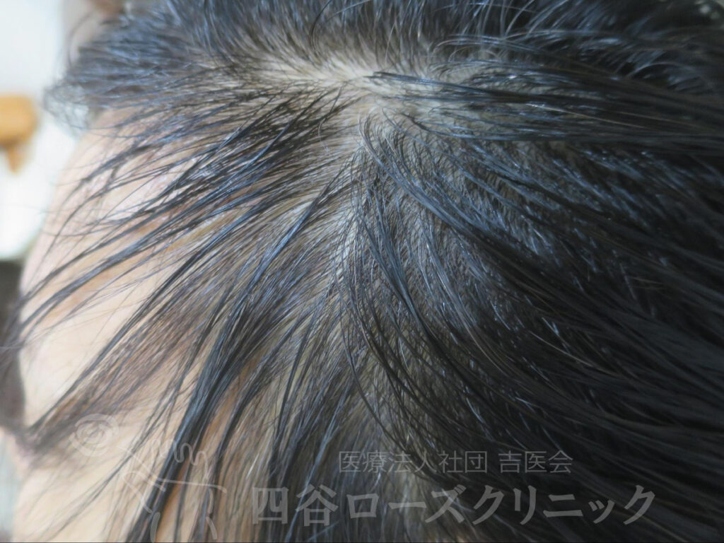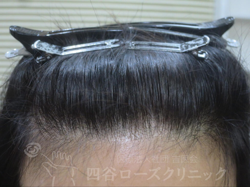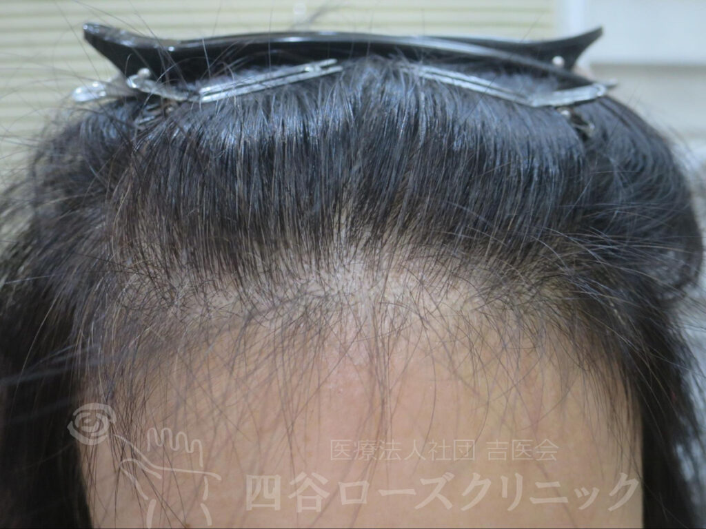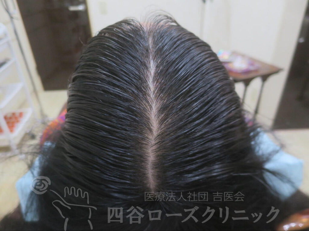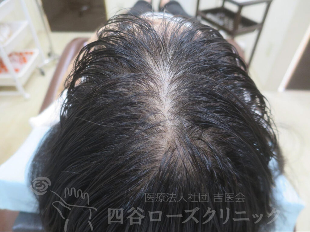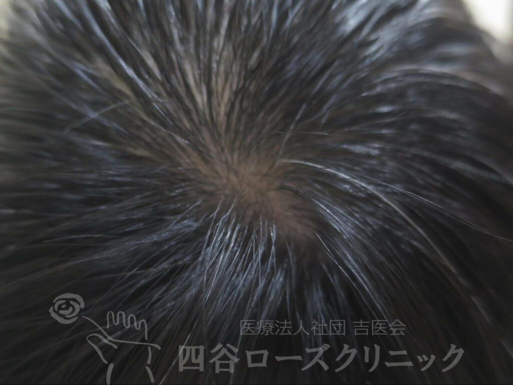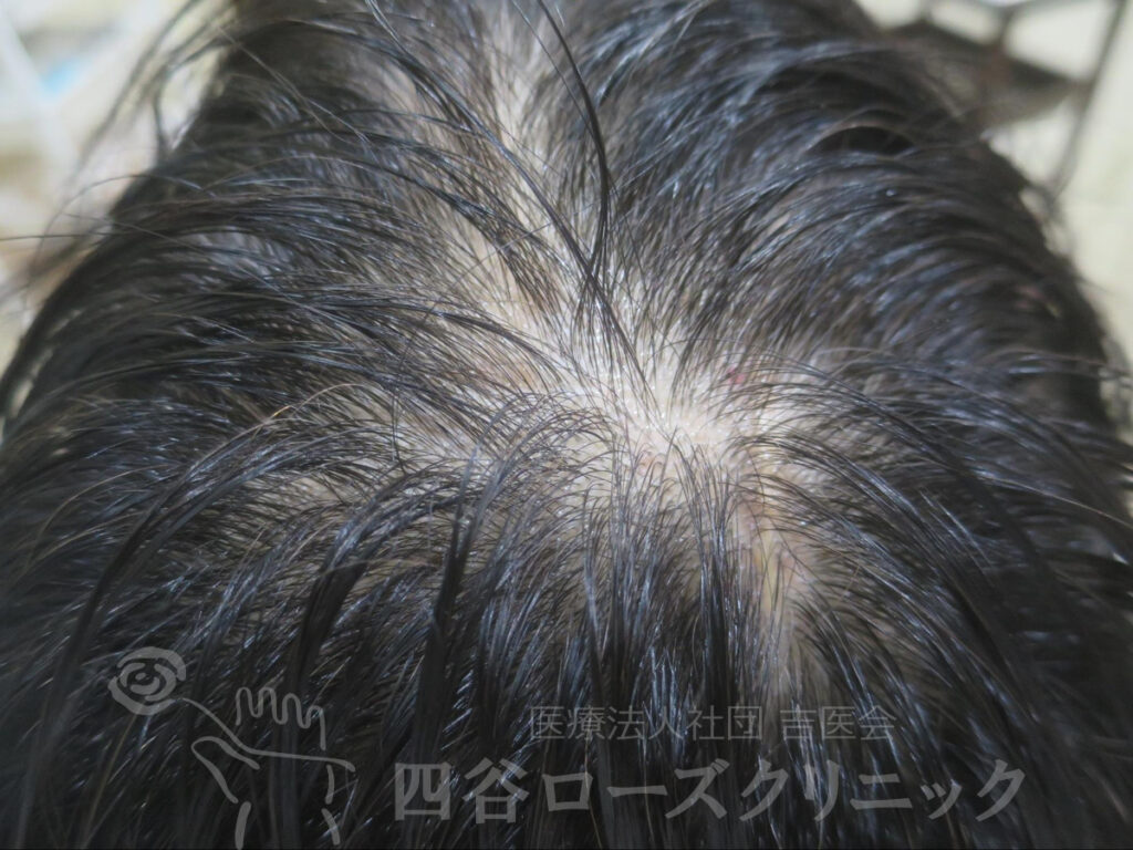 女系の薄毛の遺伝なし。2回出産、産後脱毛なし。未治療。前頭部、分け目は軽症だが、つむじは中等症で自分では見えない為、薄毛の発見が遅れた症例。