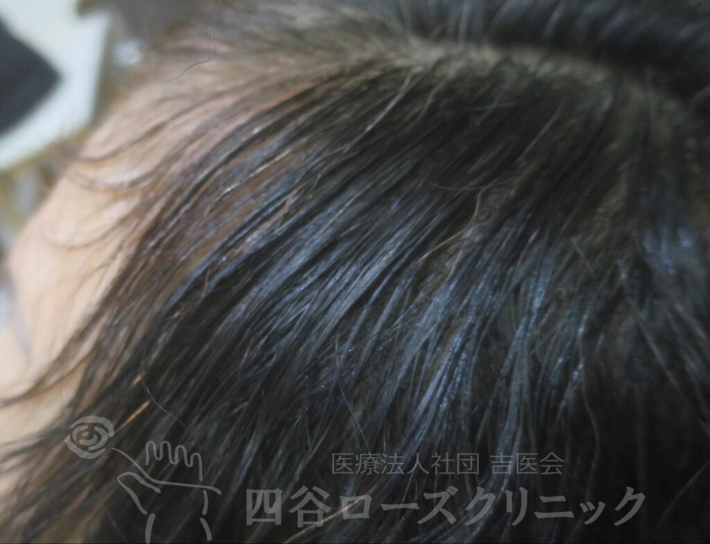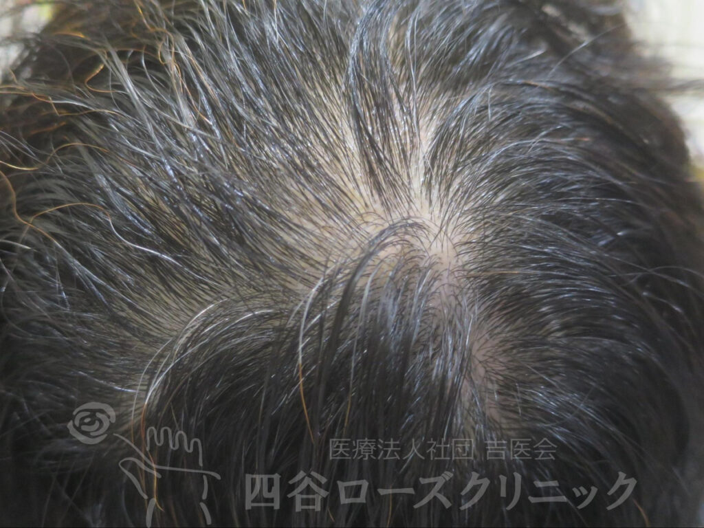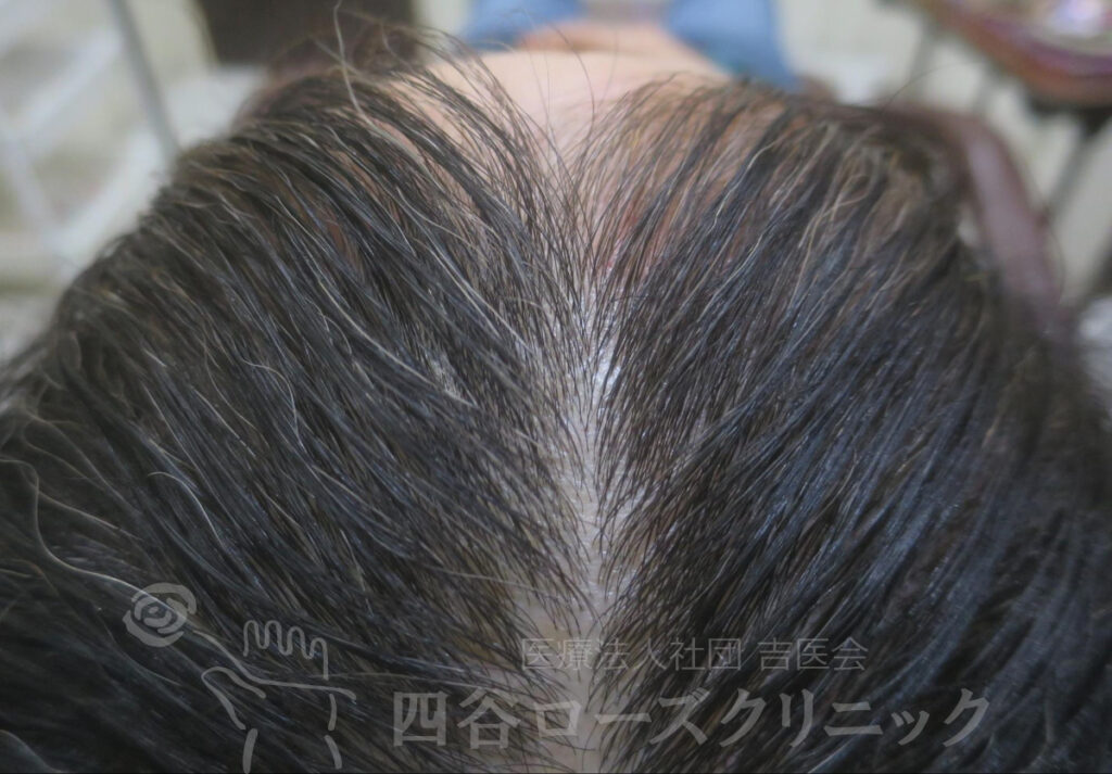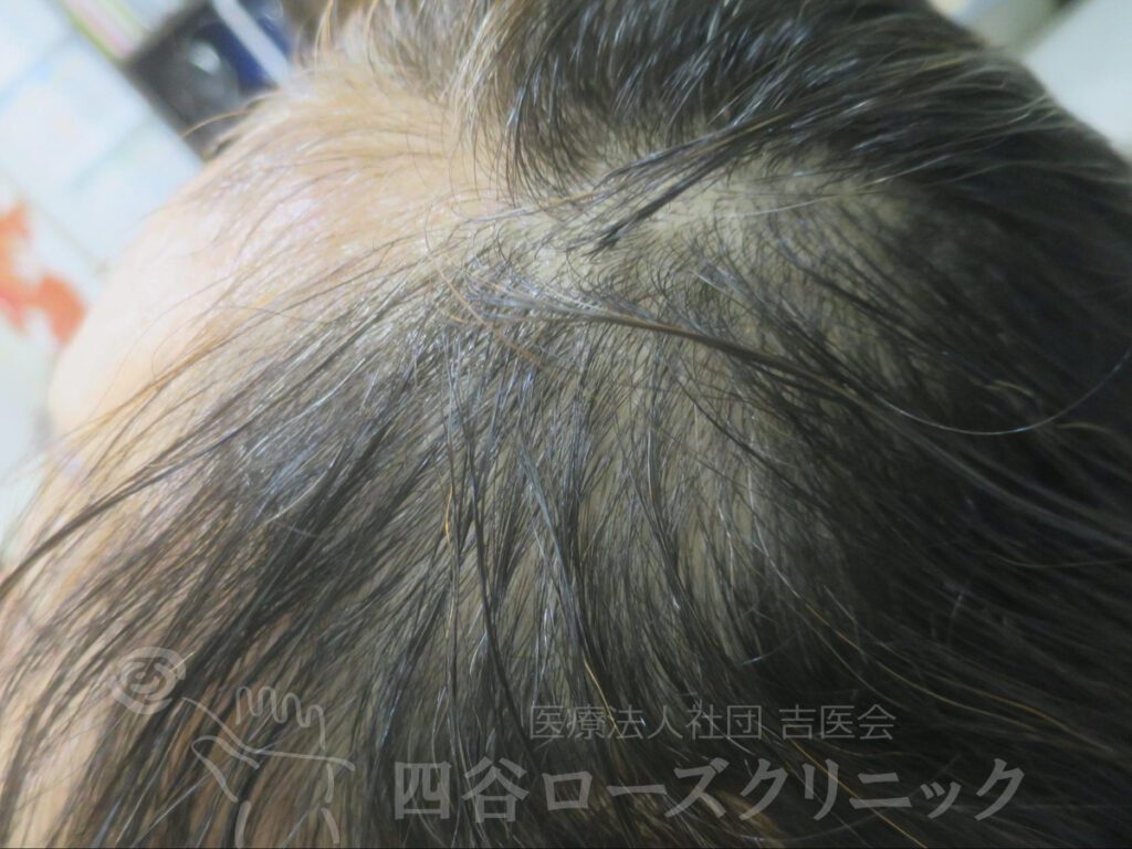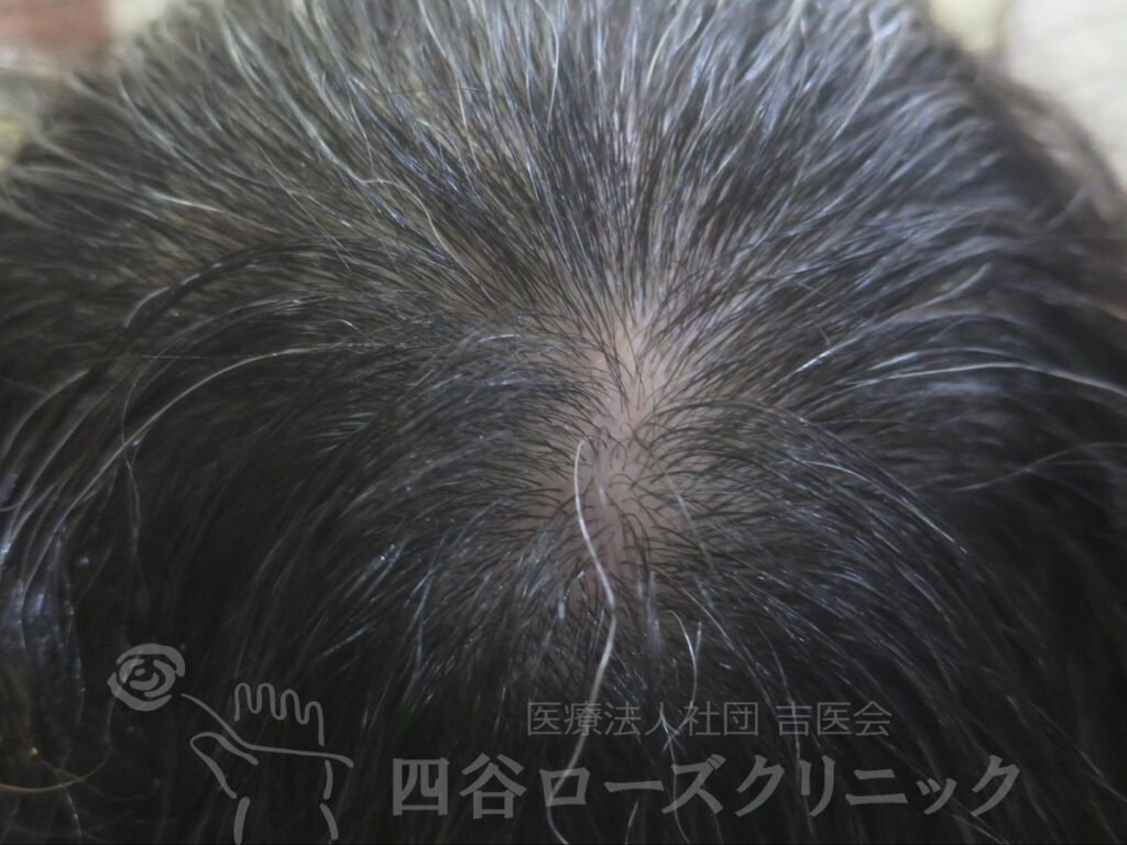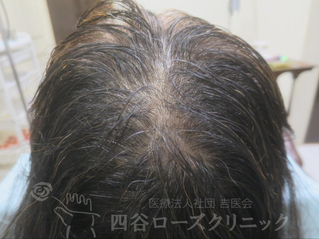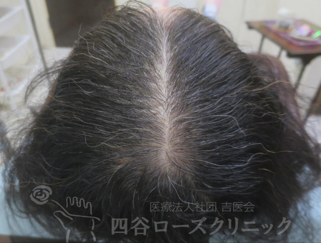 女系の薄毛遺伝なし。更年期以降、髪質が細くなりボリュームダウン。特に前頭部の薄毛を自覚。中等症、未治療。60歳を超えていたので、治療に対する反応はやや緩慢であったが、7回の施術で満足いく効果が得られた。メンテナンスは半年ごとに受けるように指示しました。