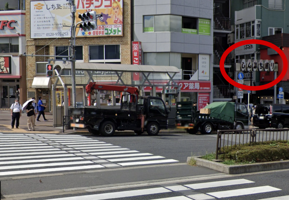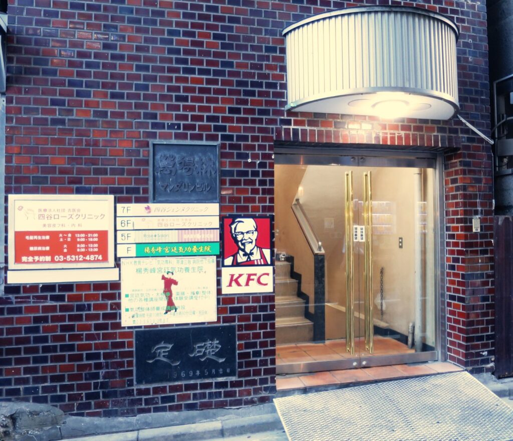 左側2件目(壁面に当院看板)の「マンダリンビル」のガラス扉から入ります。(KFC正面入口の裏側になります)