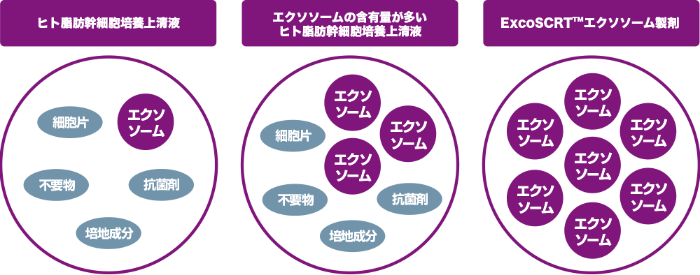 エクソソームとは、細胞から分泌される顆粒状の細胞外小胞で、タンパク質、成長因子、核酸などが含まれており、分泌細胞からターゲット細胞にメッセージを伝えるメッセンジャーとして働く「細胞間の伝達物質」です。