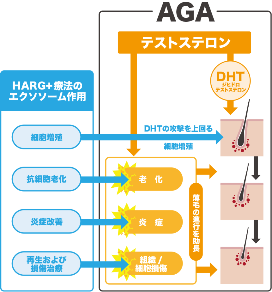 HARG療法は毛根を再生させる治療法ですのでDHTの攻撃をブロックする作用はありませんが、DTHの攻撃によるダメージを上回る細胞増殖作用により毛根が再生されるので「発毛が促進される」というメカニズムです。